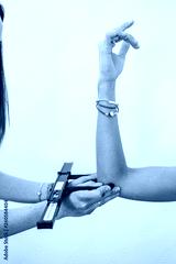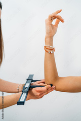Doctor taking patient's body fat measurements on arms with fat caliper