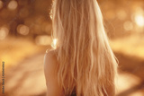 blonde long hair nature summer / happy adult girl with developing in the wind long blonde hair in the summer field