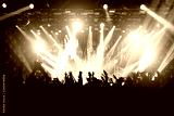 Satisfied people at the concert, colored light from the stage.