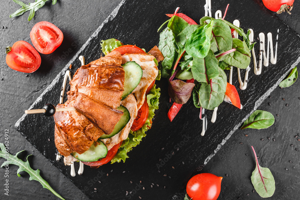Croissant sandwich with fillet grilled chicken, fresh vegetables, cheese and greens on black shale board over black stone background. Healthy food concept