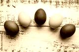Row of five colorful easter eggs on wooden background