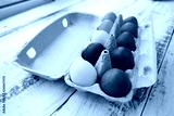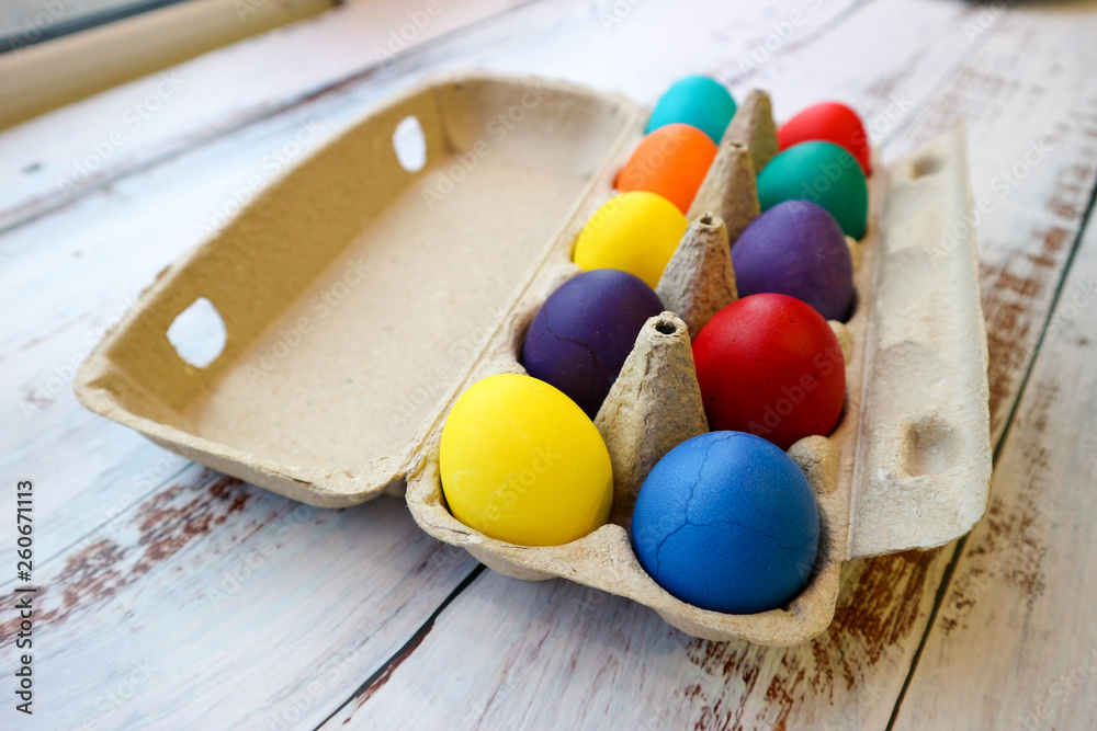 Easter is coming! colorful bright easter eggs in carton egg box on wooden table background