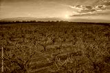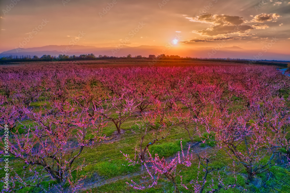 orchard of peach trees in bloomed in spring
