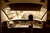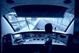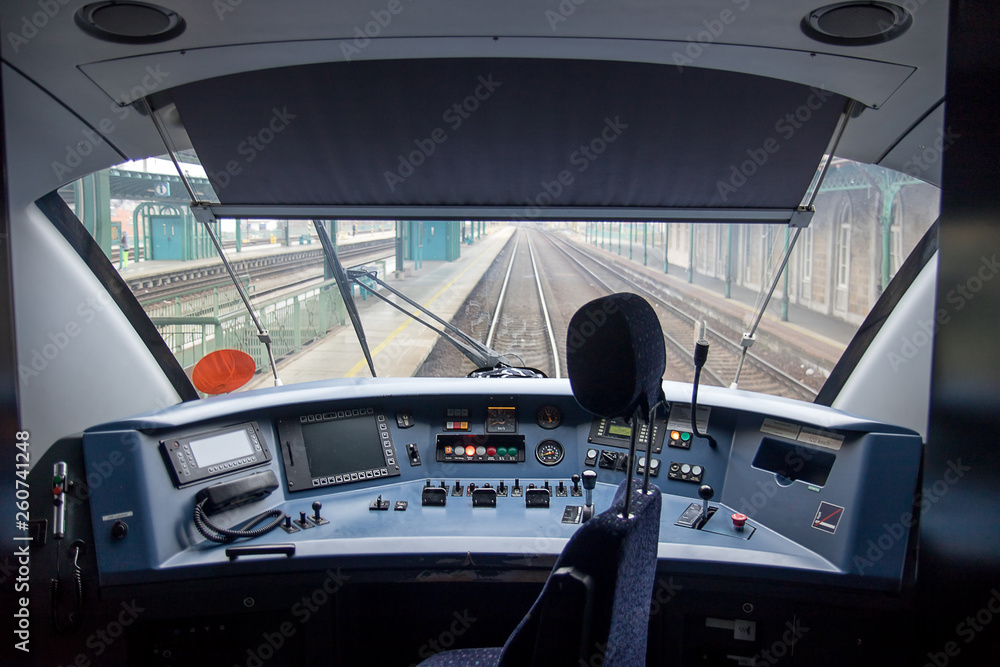 View through the windshield in the driver's cabin of a train in a station. Cockpit modern train.