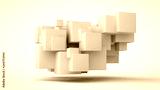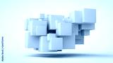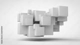 3D rendering lots of white cubes in space, randomly arranged, of different sizes, hanging in the air. Abstract representation of geometrically correct objects. Isolated on white background
