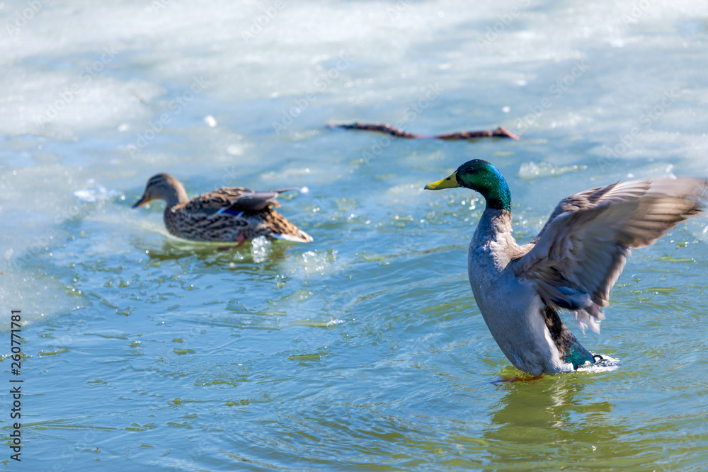 The duck and drake resting on the ice of city spring pond or lake in the sunny day