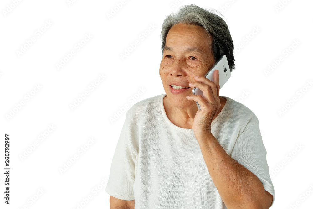 Portrait of elderly asian woman are using mobile phone with a smile isolated on white background, Communication technology for happy and good mood concept