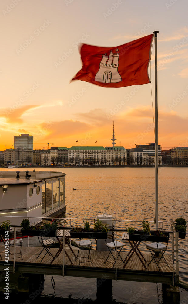 Die Hamburger Flagge vor der schönen Binnenalster bei Sonnenuntergang