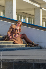 Attractive middle-aged woman wearing stylish coat and shoes sitting with bag on stairs step of office building in early spring at sunset. Street city portrait, fashion urban outfit