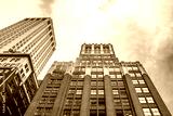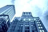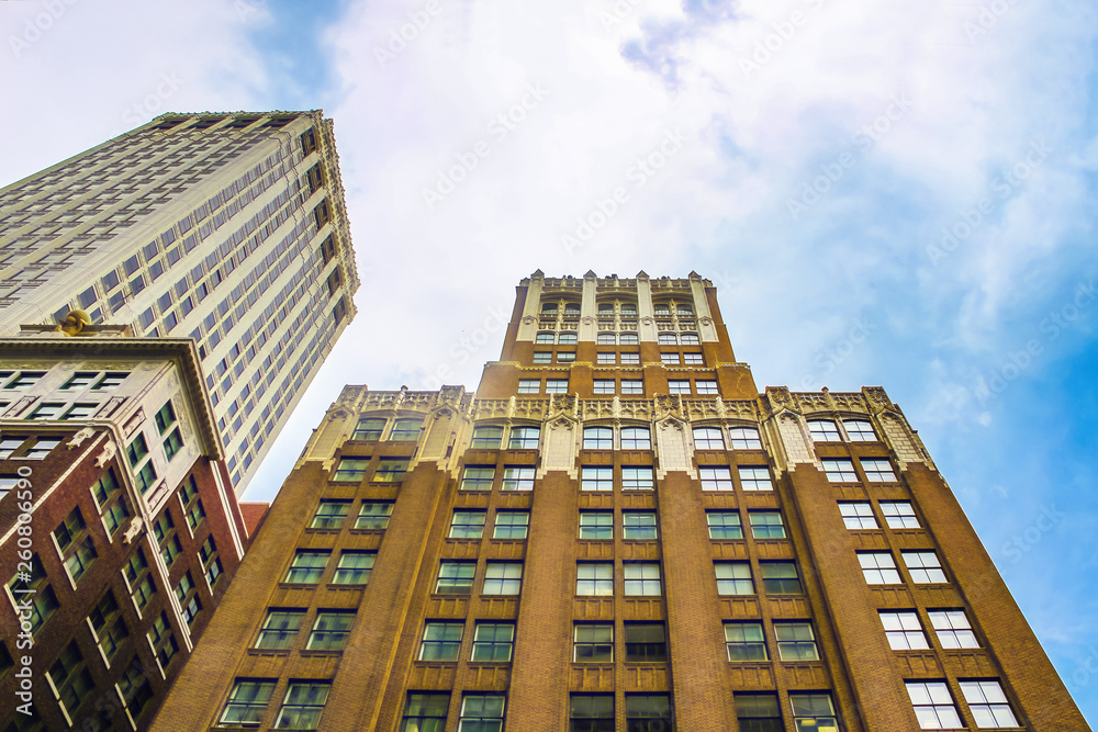 Perspecitive view of new and old office buildings looking up at them from ground level against cloudy blue sky - room for copy
