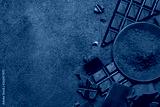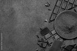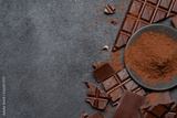 Frame or border made of Dark or milk organic chocolate pieces and cocoa powder on dark concrete backgound