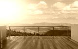 Balcony view of mountains. Landscape. Sunny Day. Terrace with a beautiful view. Background with beautiful landscape.