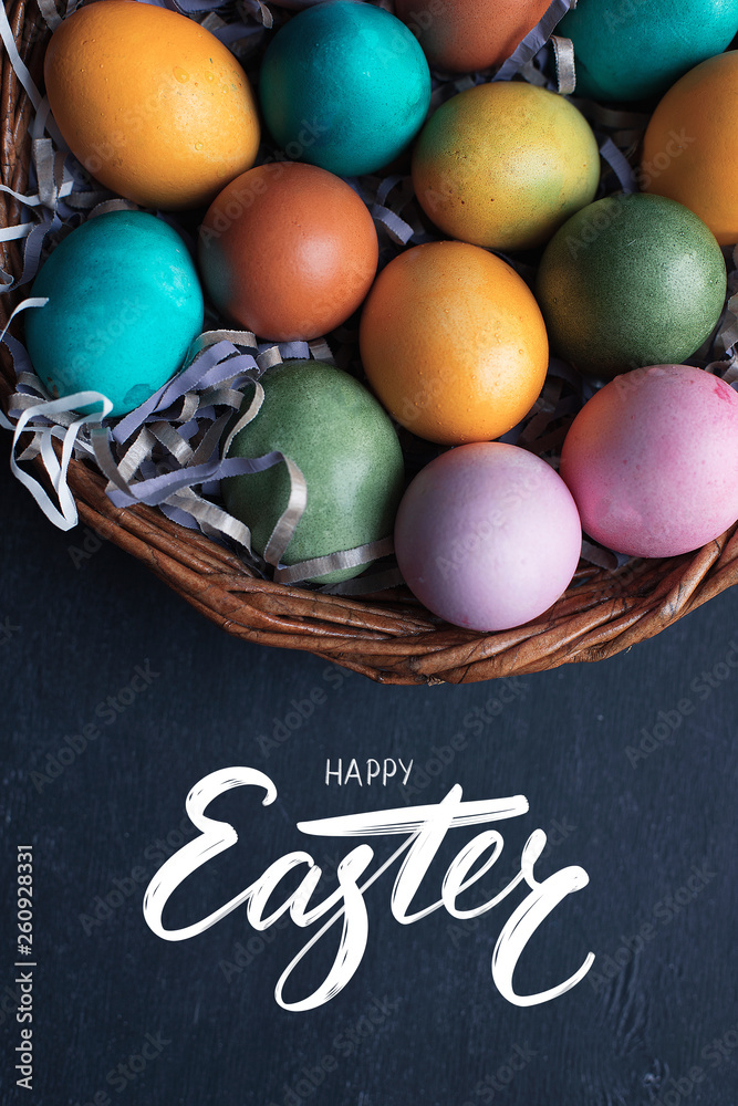 Happy Easter hand lettering inscription and colorful easter eggs in basket on black wooden background.