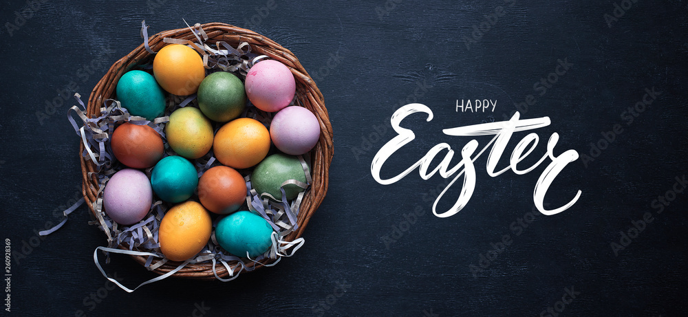 Happy Easter hand lettering inscription and colorful easter eggs in basket on black wooden background.