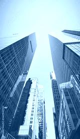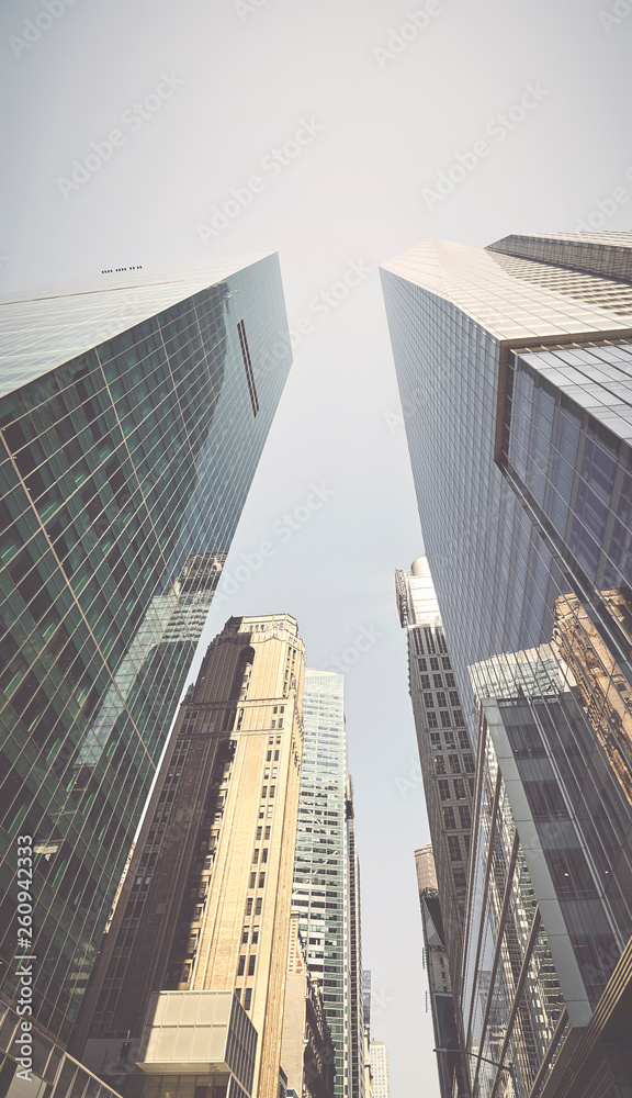 Looking up at Manhattan skyscrapers, retro color toned picture, New York City, USA.