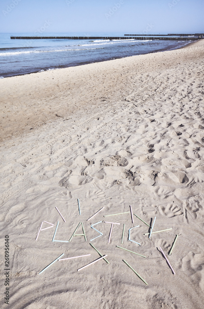 Plastic word made of plastic straws on sand, color toned picture, selective focus.