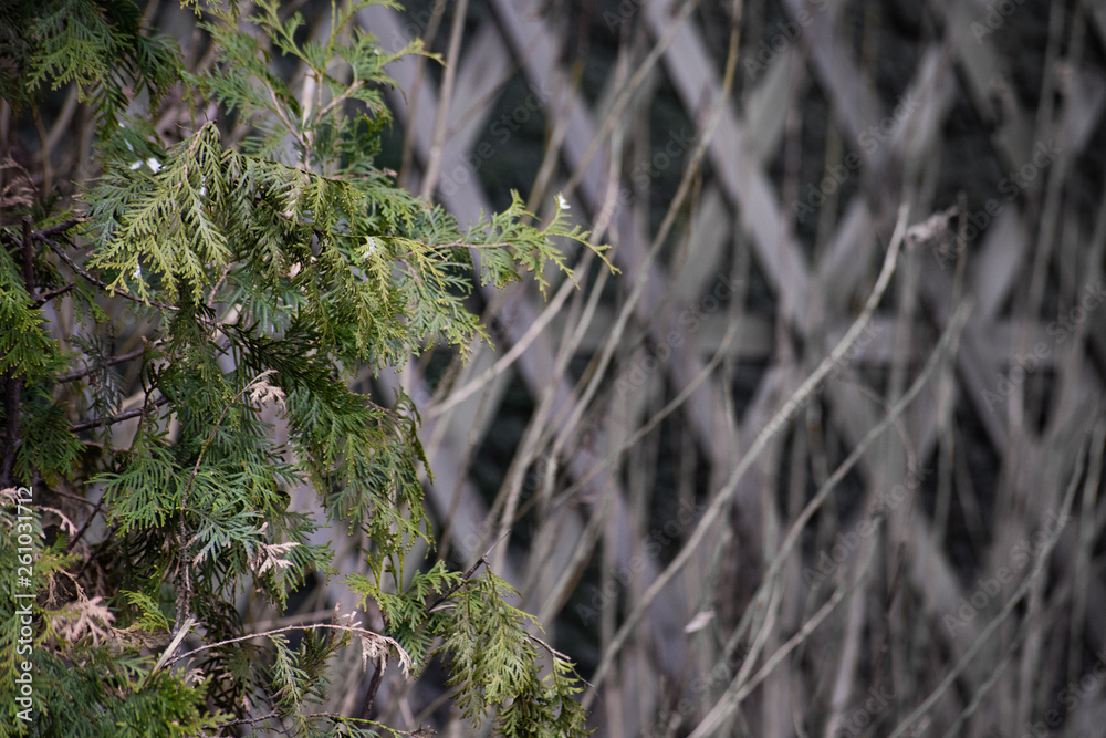 Thuja branches on the background of a decorative hedge