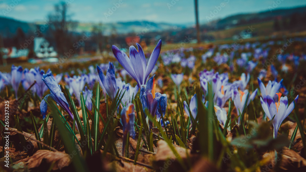 Wiosenne krokusy na łące