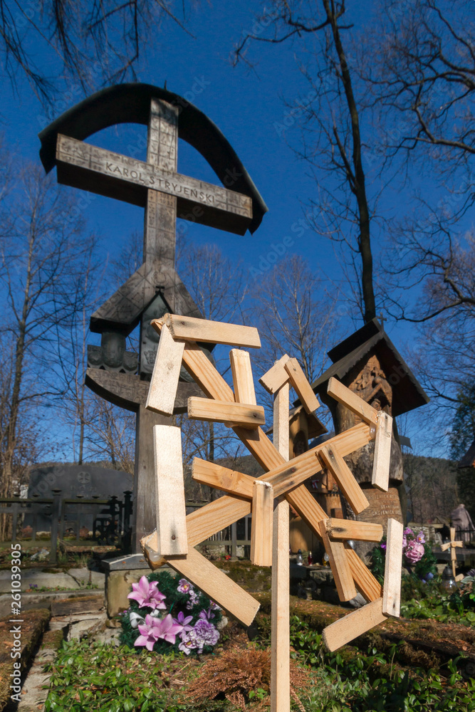 Drewniany krzyż na cmentarzu na Pęksowym Brzysku w Zakopanem