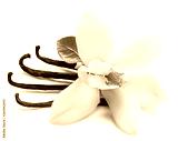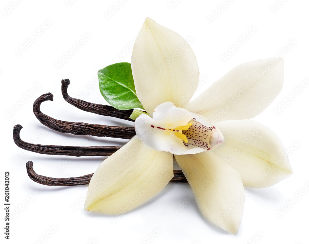 Dried vanilla sticks and orchid vanilla flower isolated on white background.