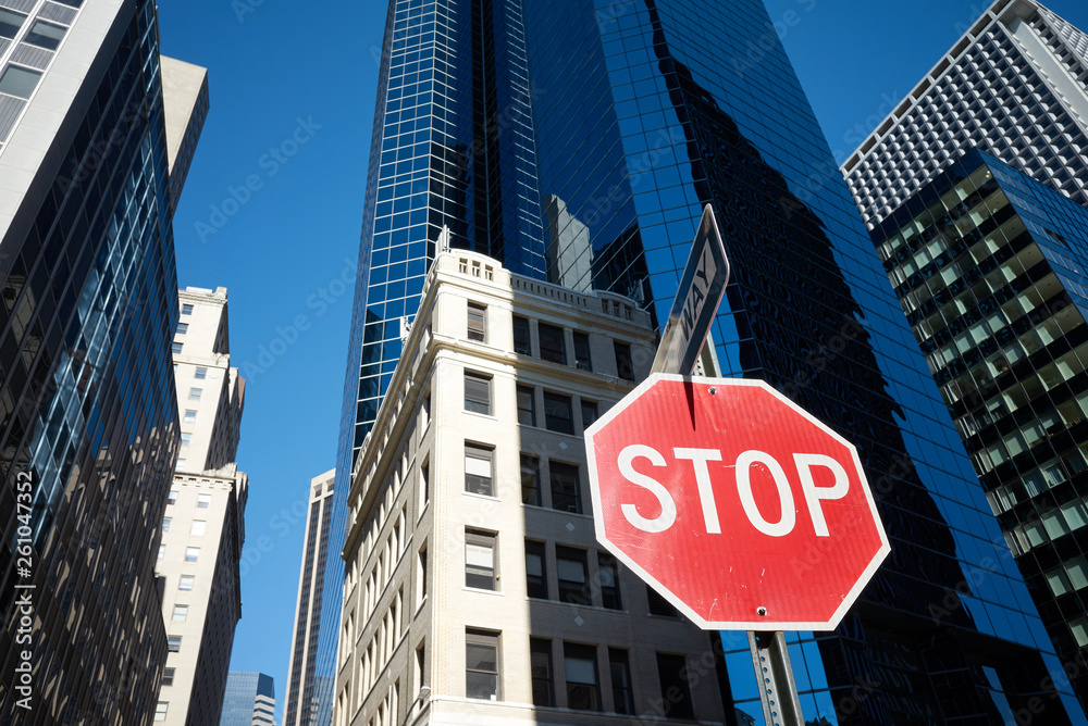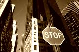 Stop sign on a street of New York City, modern buildings in background, USA.