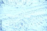 Snow-covered road with tire tracks and bushes on the side of the road