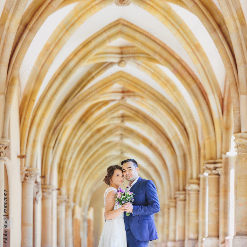 happy wedding couple in the church