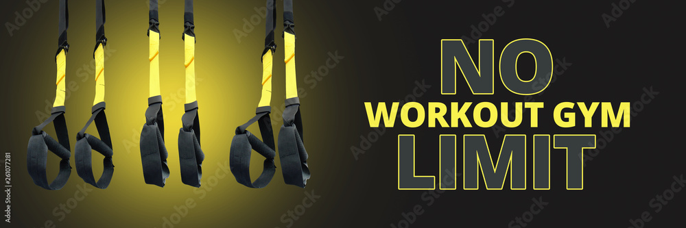 Straps training loop equipment. Black loop functional training equipment on grey background. Sport accessories. Fitness and Gym workout items for Healthy. Advertising banner