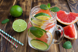 Detox or infused water with grapefruit and lime on the brown wooden background.Closeup.