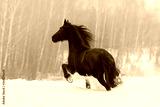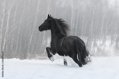 Black friesian horse with the mane flutters on wind running on the snow-covered field in the winter background. Back side view.