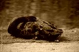 Black swan, Cygnus atratus wild bird relaxing on grass. Australian black swan close up portrait