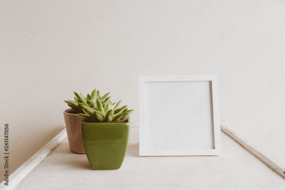 Close up of pots with succulents and blank square picture frame on table against neutral wall background (warm matte filter effect and selective focus)
