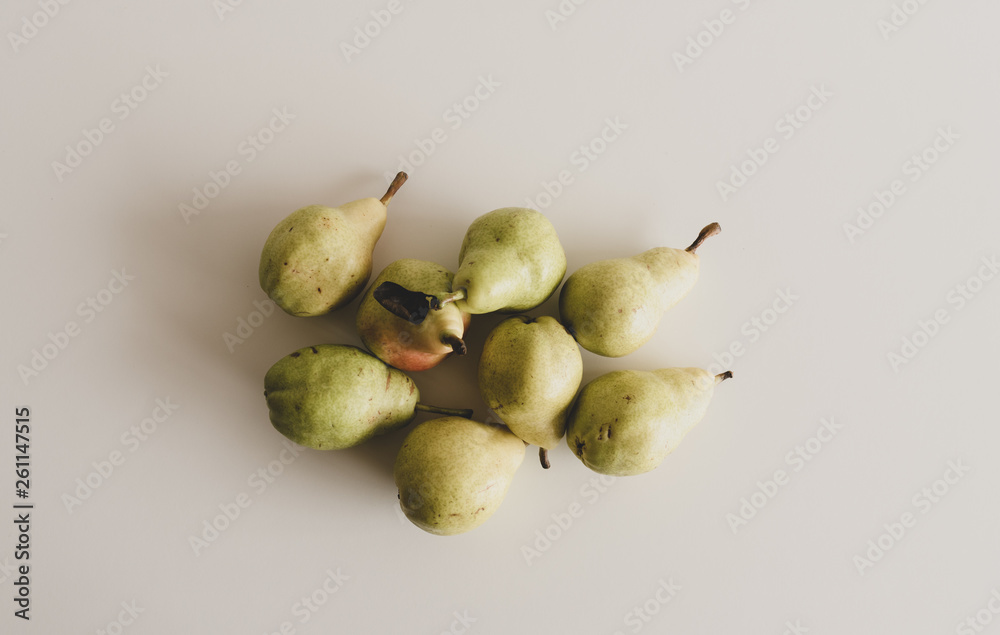 High angle view of pears on white shelf with matte vintage filter effect (selective focus)