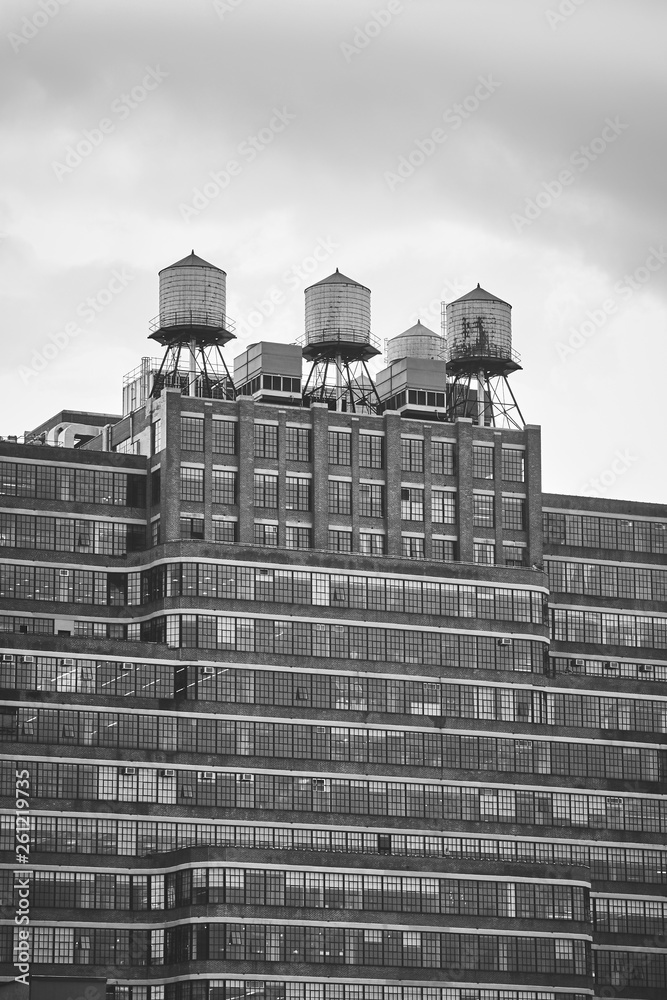 Water towers on a building rooftop, New York.