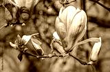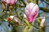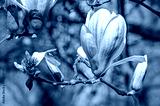 close-up of a single magnolia flower against a background of soft green and blue bokeh