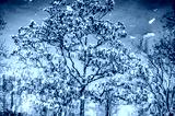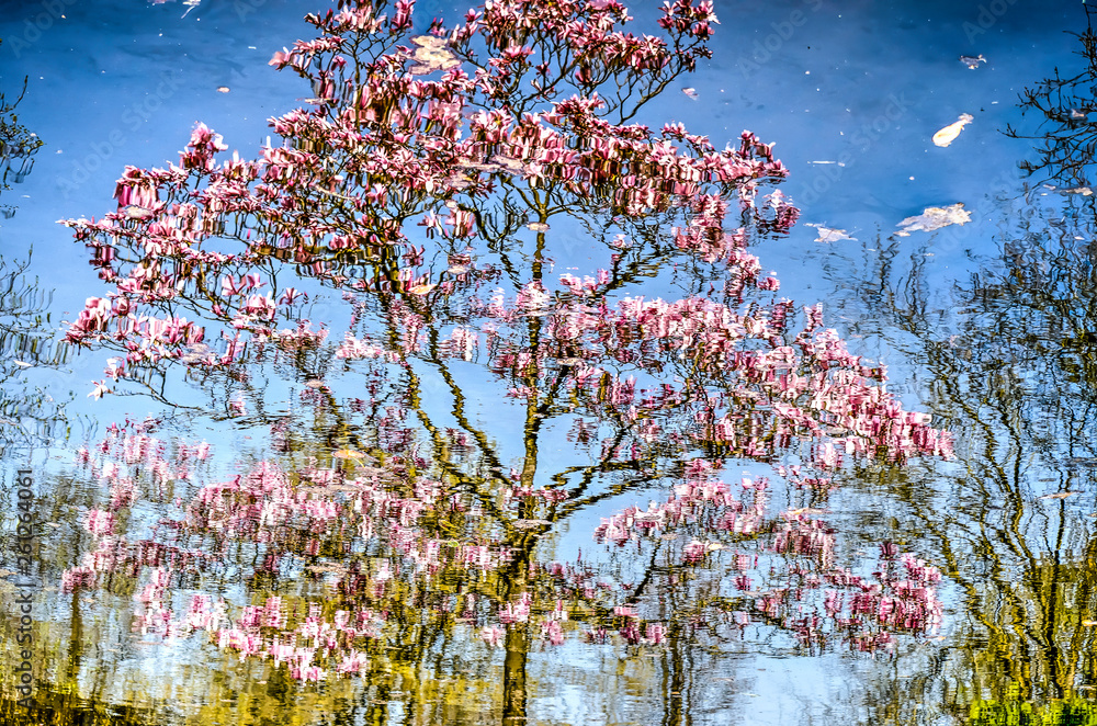 Reflection of a magnolia tree in springtime in the smooth water of a pond