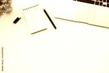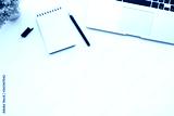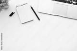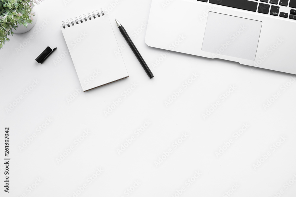 White office desk table with blank notebook page with pen and laptop computer. Top view with copy space, flat lay.