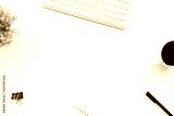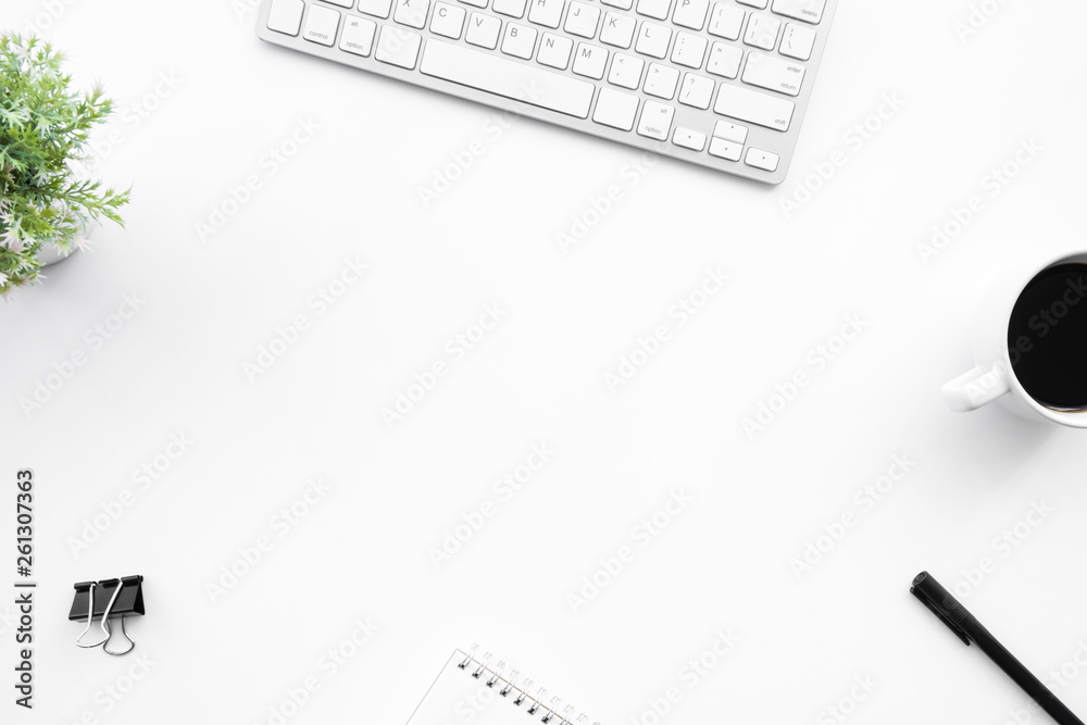 White office desk table with computer tools, cup of coffee and supplies. Top view with copy space, flat lay.