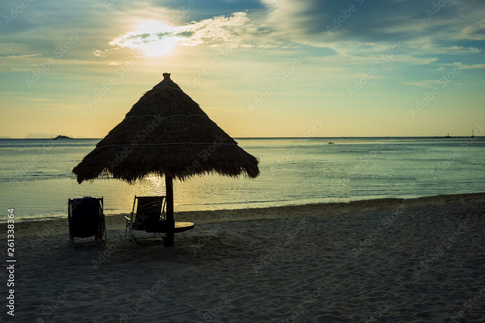 Sunset between palm trees and beach umbrellas at Thailand
