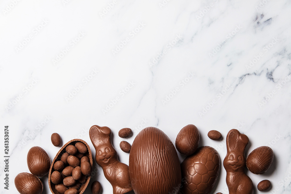 Chocolate easter eggs and bunnies on a marble background