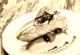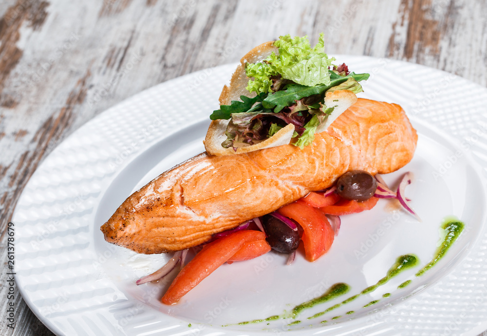 Baked salmon garnished with olives, greens, tomatoes on plate over wooden background. Hot fish dish