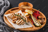Grilled fillet fish and vegetables with spice sauce on cutting board over black stone background. Hot fish Dishes