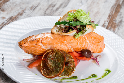 Baked salmon garnished with olives, greens, tomatoes on plate over wooden background. Hot fish dish