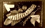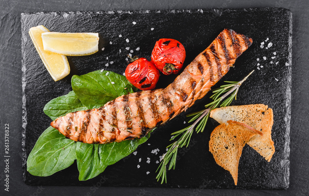 Grilled salmon fillet garnished with spinach, lemon, herbs on plate over wooden background. Hot fish dish. Top view, flat lay