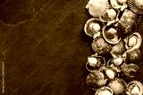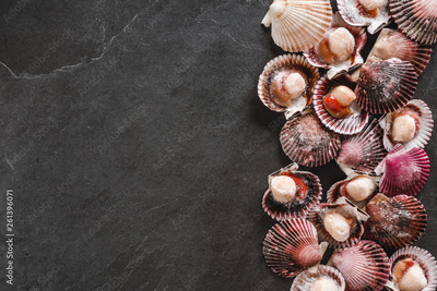 Raw scallops on slate stone background. Seafood, Shellfish, top view, flat lay, macro
