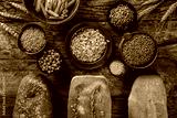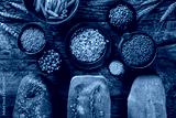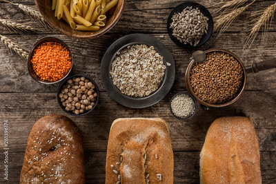 Different fresh bread and Cereals on rustic wooden background. Creative layout made of bread. Healthy food concept, top view, flat lay, copy space