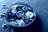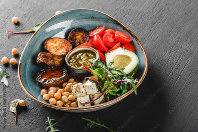 Healthy Buddha bowl dish with avocado, tomato, cheese, chickpea, fresh arugula salad, baked potatoes and sauce pesto in black background. Dieting food, clean eating