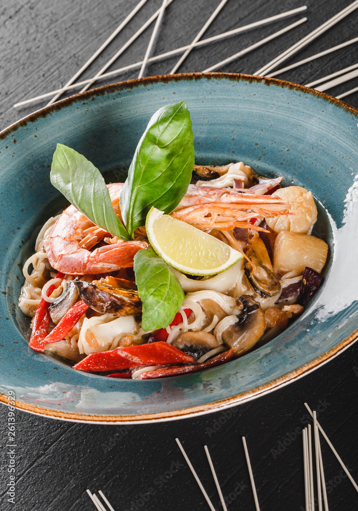 Pasta spaghetti with seafood, langoustine, mussels, oysters, squid in mushrooms sauce on plate over dark stone background. Italian food