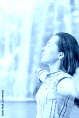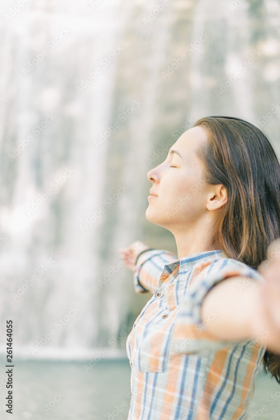Young woman relaxing on background of waterfall.