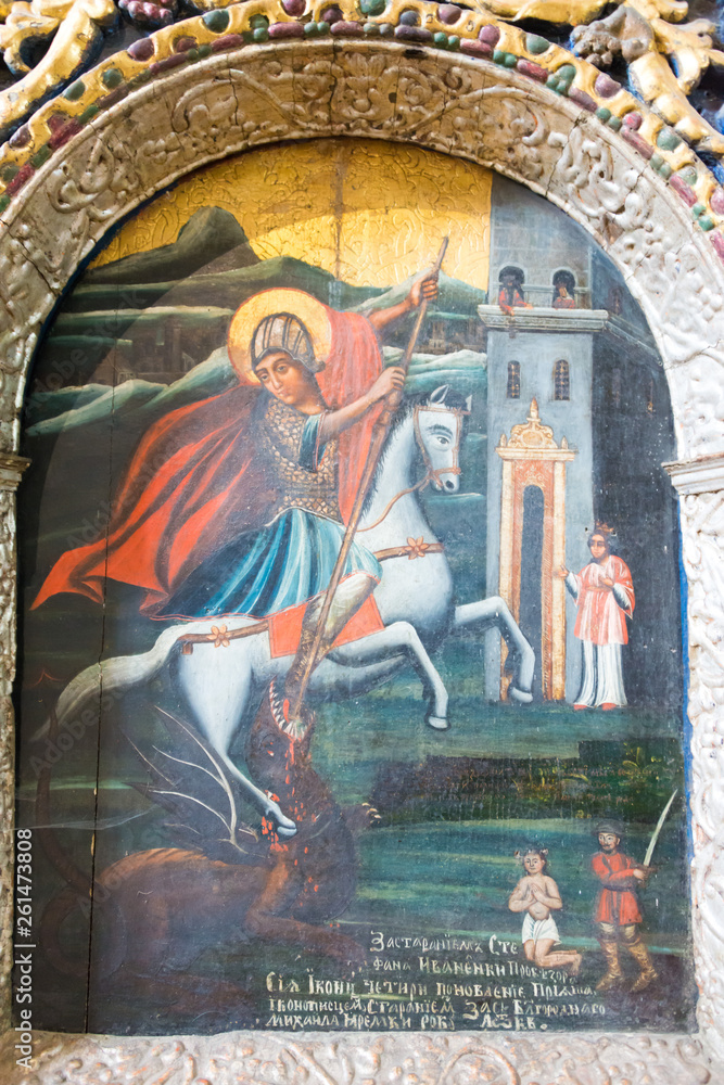 Drohobych, Ukraine - May 20 2018- Ancient Mural at St. George's Church in Drohobych, Ukraine. It is part of the World Heritage Site - Wooden Tserkvas of the Carpathian Region in Poland and Ukraine.